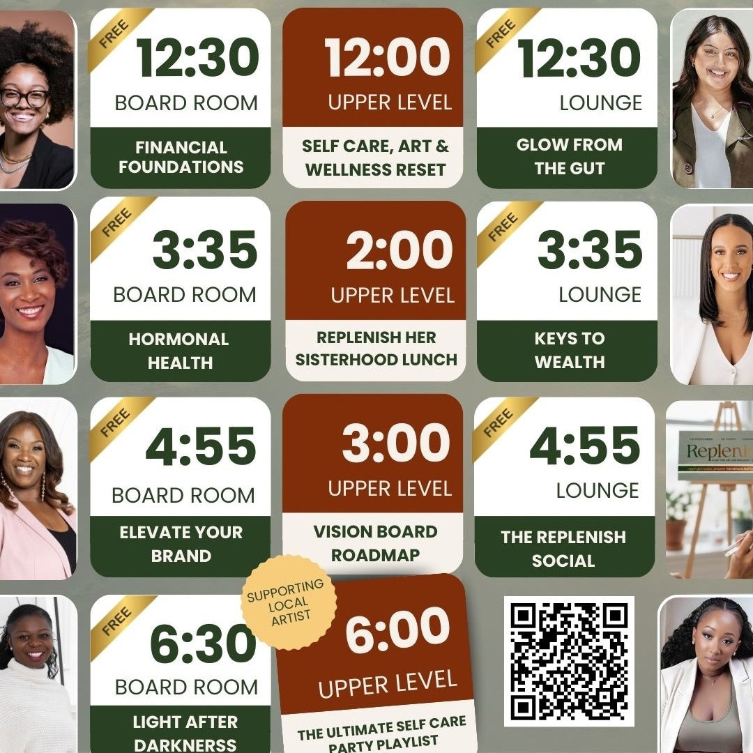 Replenish is your day to reset, imagine freely, and build your vision roadmap with guidance, community, and intention. Reserve your FREE drop-in wellness sessions with one of our mindful experts or BUY a Replenish Pass and have full access to The Ultimate Getaway, including the Ultimate Self Care Playlist Party!